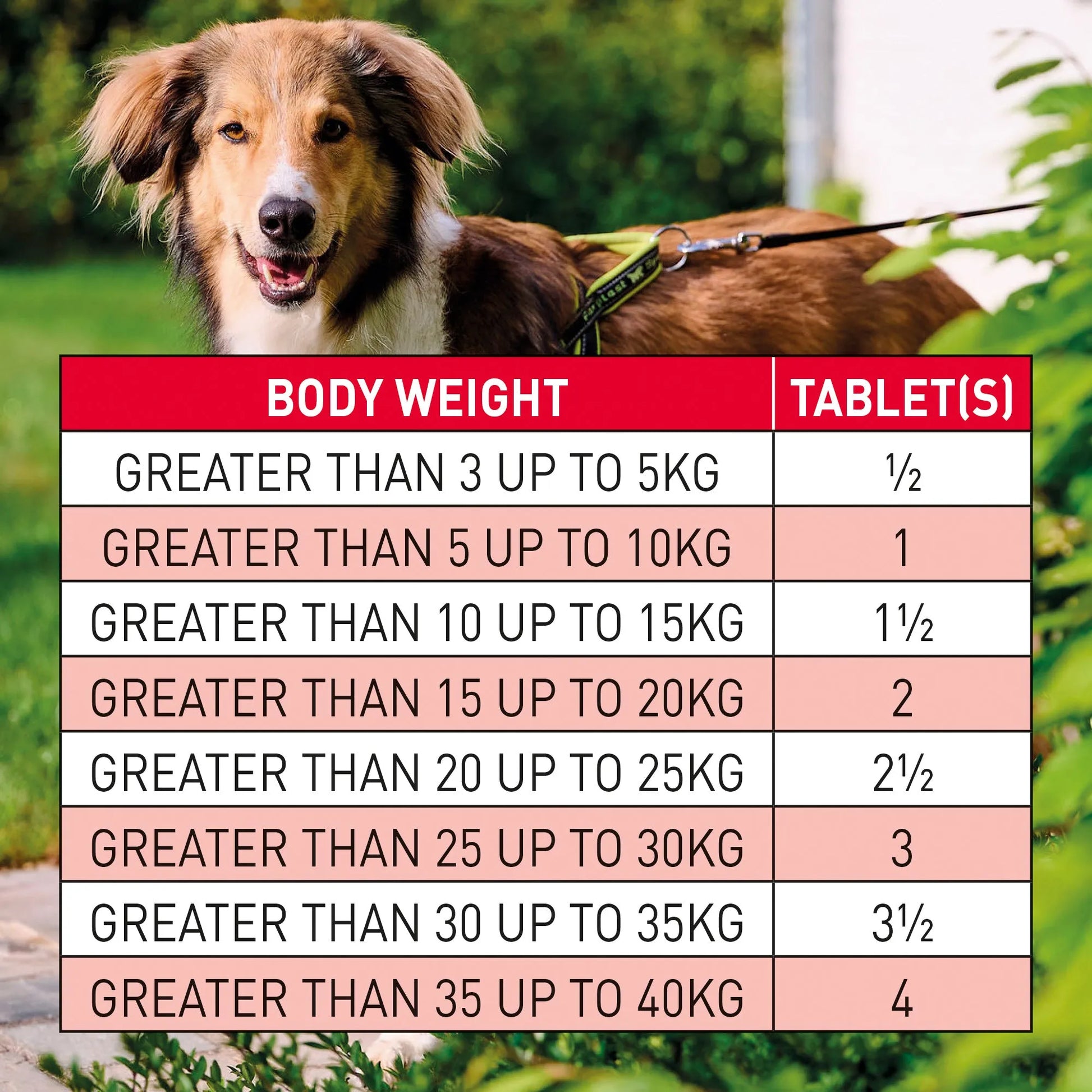 ALWAYS FULLY READ THE PRODUCT LEAFLET AND PACKAGING BEFORE USE. Do not remove the tablet(s) from the foil blister until you are ready to use the product. Weigh your dog carefully and use the following table to calculate the correct dose. Give 1 Beaphar WORMclear‚® Tablet for Dogs per 10kg of body weight. Dogs weighing 3¢‚¬€œ5kg: ‚½ tablet Dogs weighing 5¢‚¬€œ10kg: 1 tablet Dogs weighing 10¢‚¬€œ15kg: 1 ‚½ tablets Dogs weighing 15¢‚¬€œ20kg: 2 tablets Dogs weighing 20¢‚¬€œ25kg: 2 ‚½ tablets Dogs weighing 25¢‚¬€œ30kg: 3 tablets Dogs weighing 30¢‚¬€œ35kg: 3 ‚½ tablets Dogs weighing 35¢‚¬€œ40kg: 4 tablets Tablets should be given directly to your dog but if necessary can be disguised in food. Puppies: Treat at 2 weeks of age and retreat every two weeks until they reach 12 weeks old. Thereafter they can be treated at three monthly intervals. Nursing bitches: Treat at the same time and as frequently as their puppies until weaning. Adult dogs: Treat every three months. Do not exceed the stated dose. In the event of an overdose seek immediate veterinary advice.