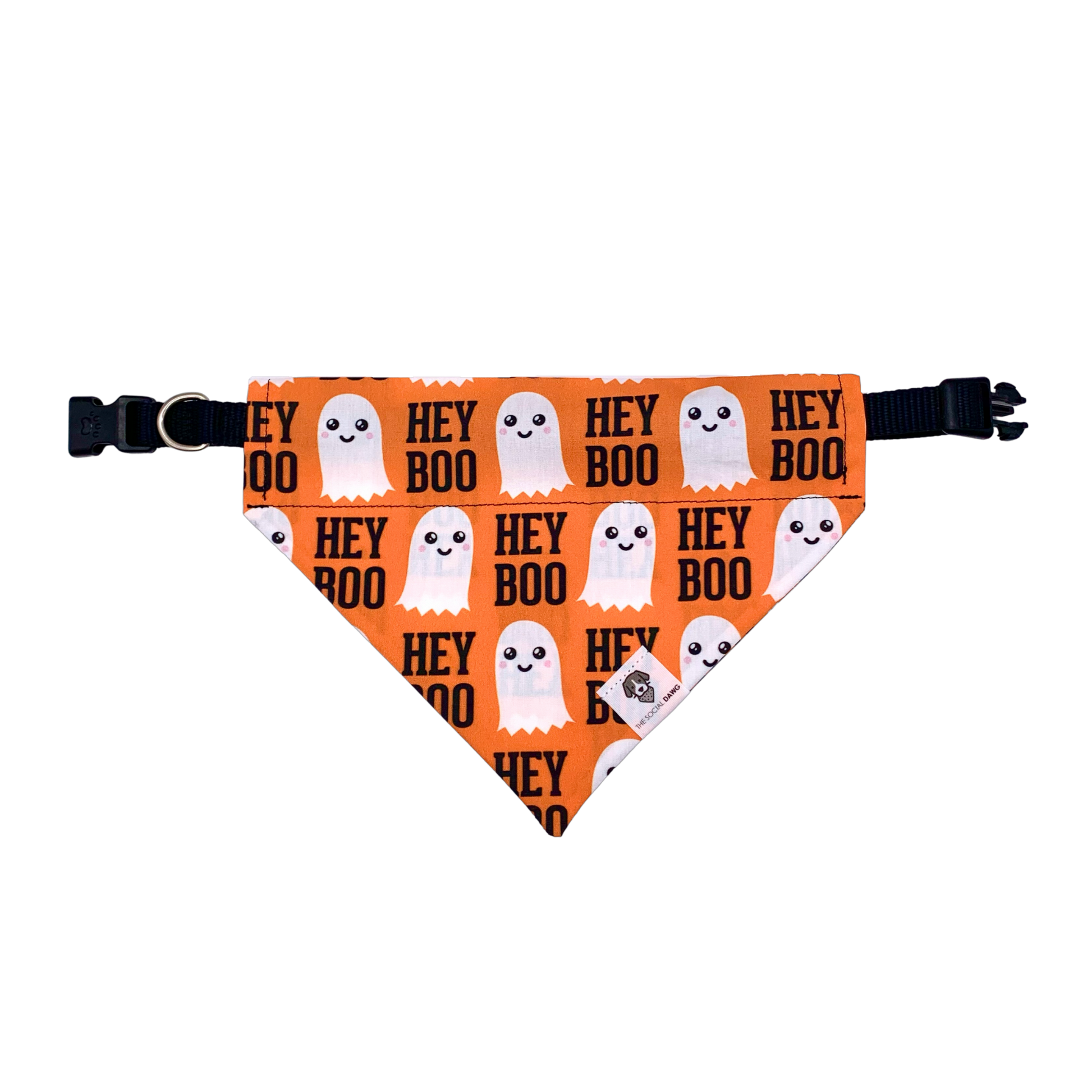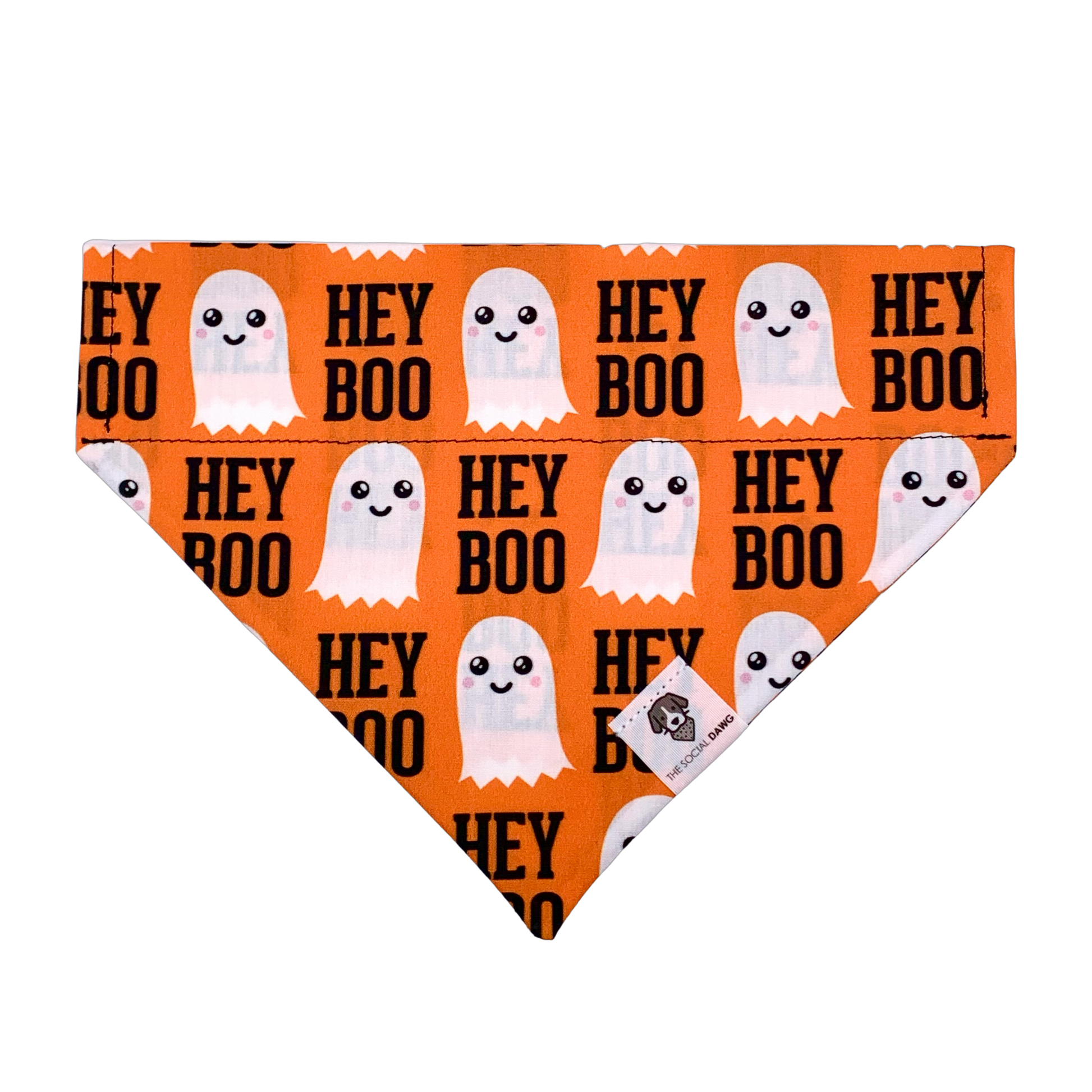 This adorable print features cute white ghosts on an orange background with "Hey Boo" lettering in black.
