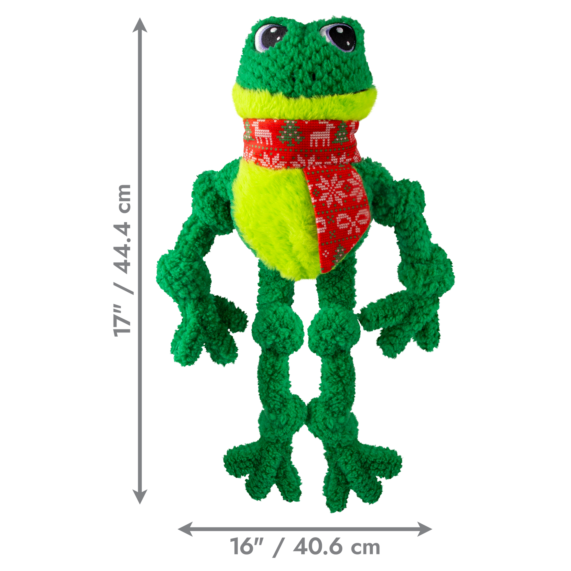 KONG Holiday Knots Frog is dressed for the season! This oversized amphibian’s full-body rope skeleton creates durability & heft for a variety of playstyles like tugging, thrashing, carrying, and gnawing. A squeaker in the head entices extended playtime, while its soft, dual-plush fur invites cuddling during quiet time. Unique details like cute froggy fingers and embroidered facial features make this frog the perfect gift for your furry best friend.