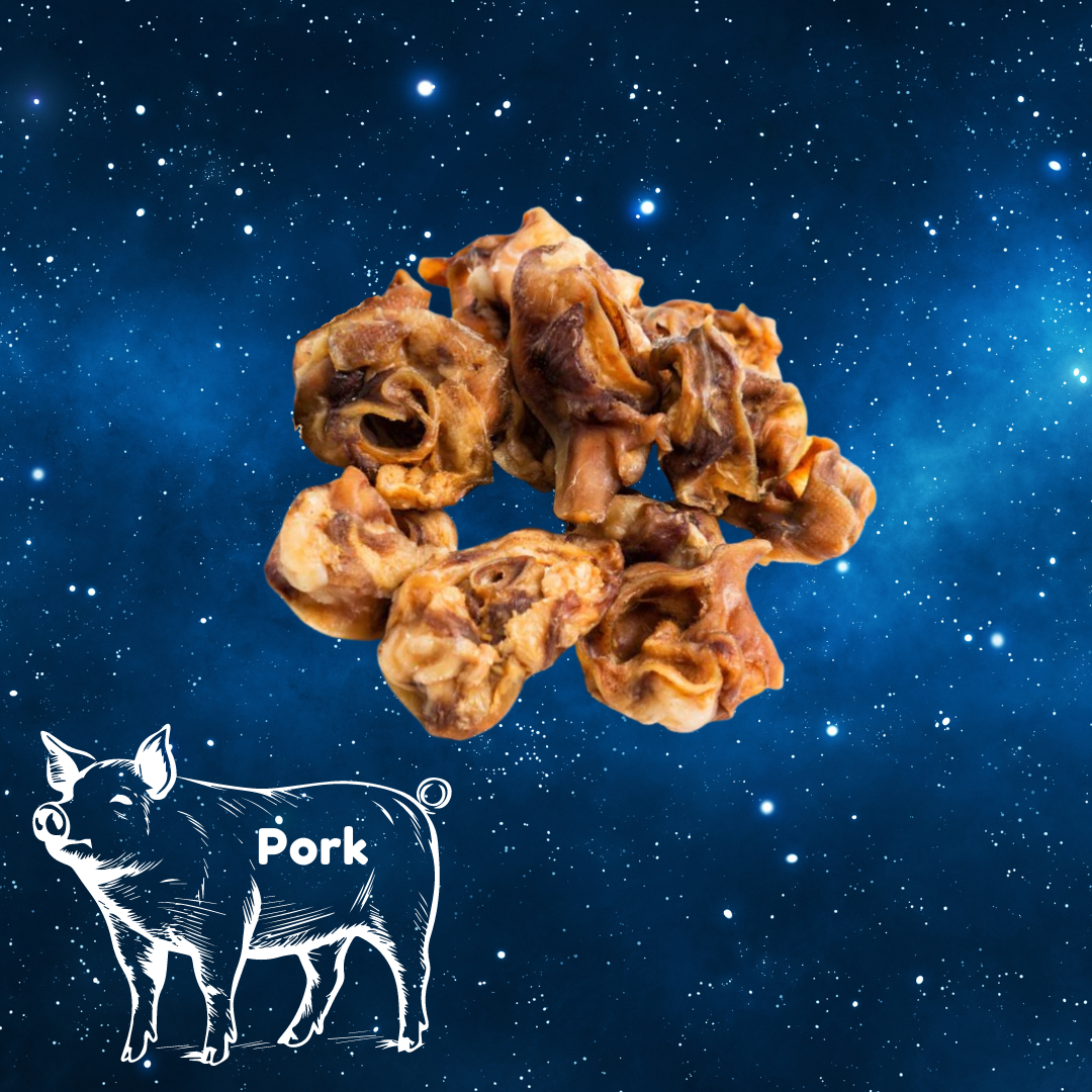 Indulge your furry friend with Pup Planet Deli's Pork Bites single pack. Made from the inner ear of the pig, these air-dried treats are not only delicious but can also strengthen your dog's jaw muscles and promote healthy teeth and gums. The added biotin makes for a shiny coat. Completely natural with no added additives or preservatives.