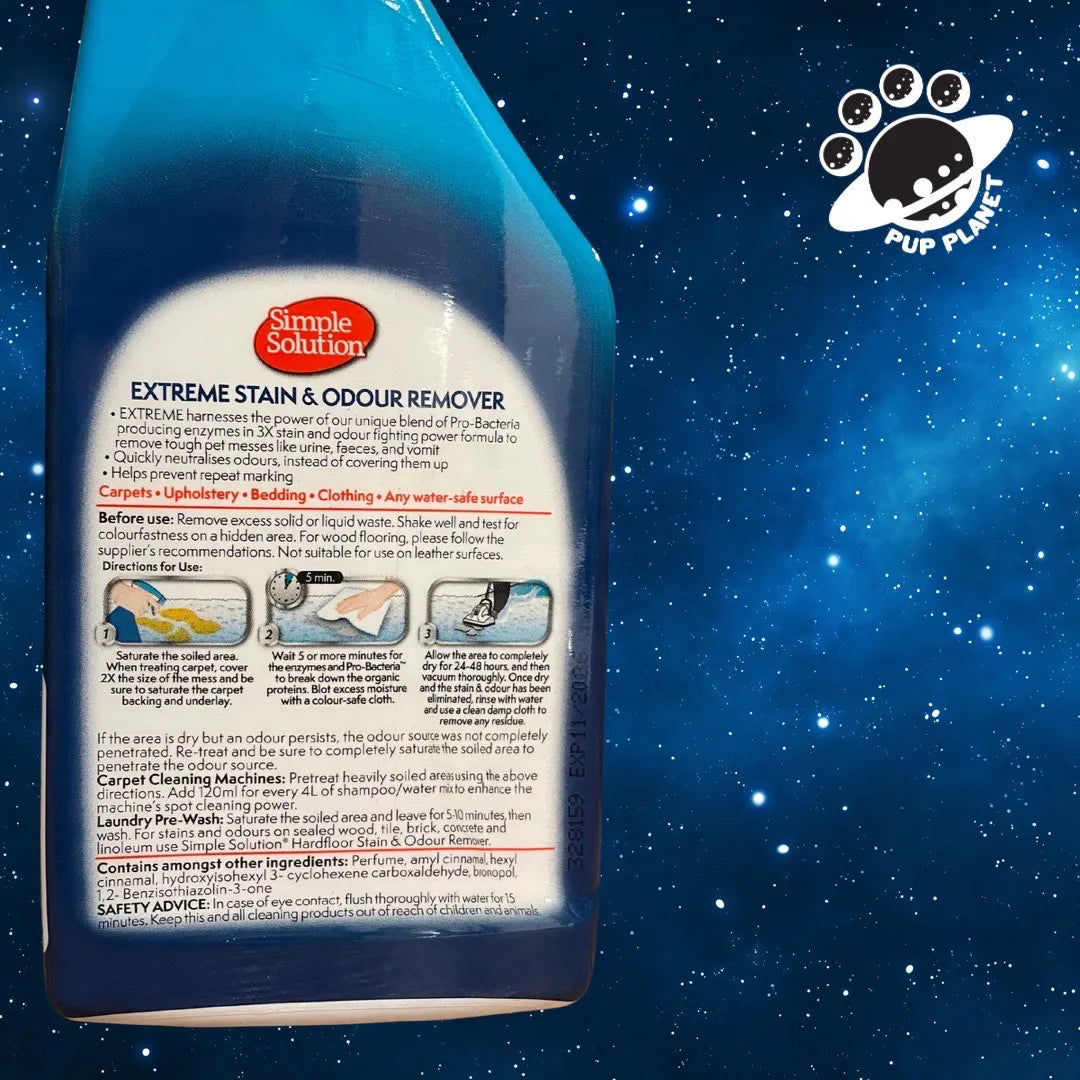 Simple Solution Stain & Odour Remover is the only formula which contains both Pro-Bacteria and enzymes which effectively remove stains and odours.