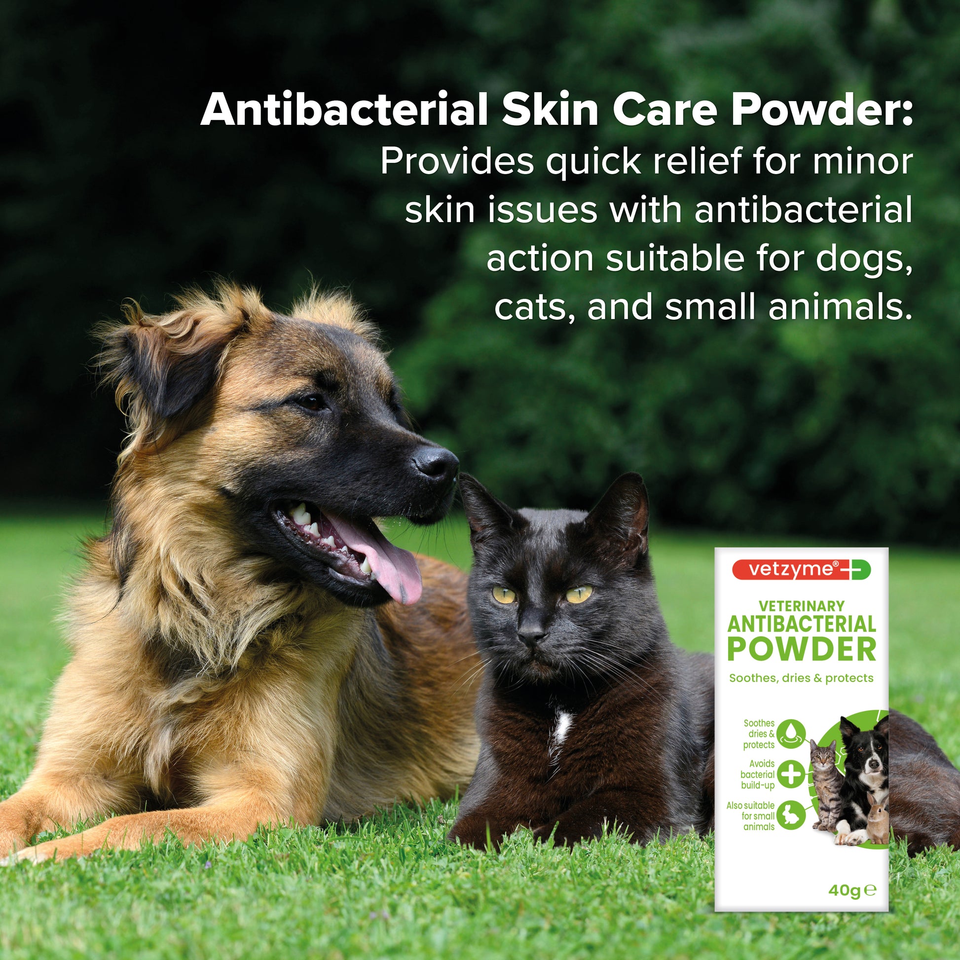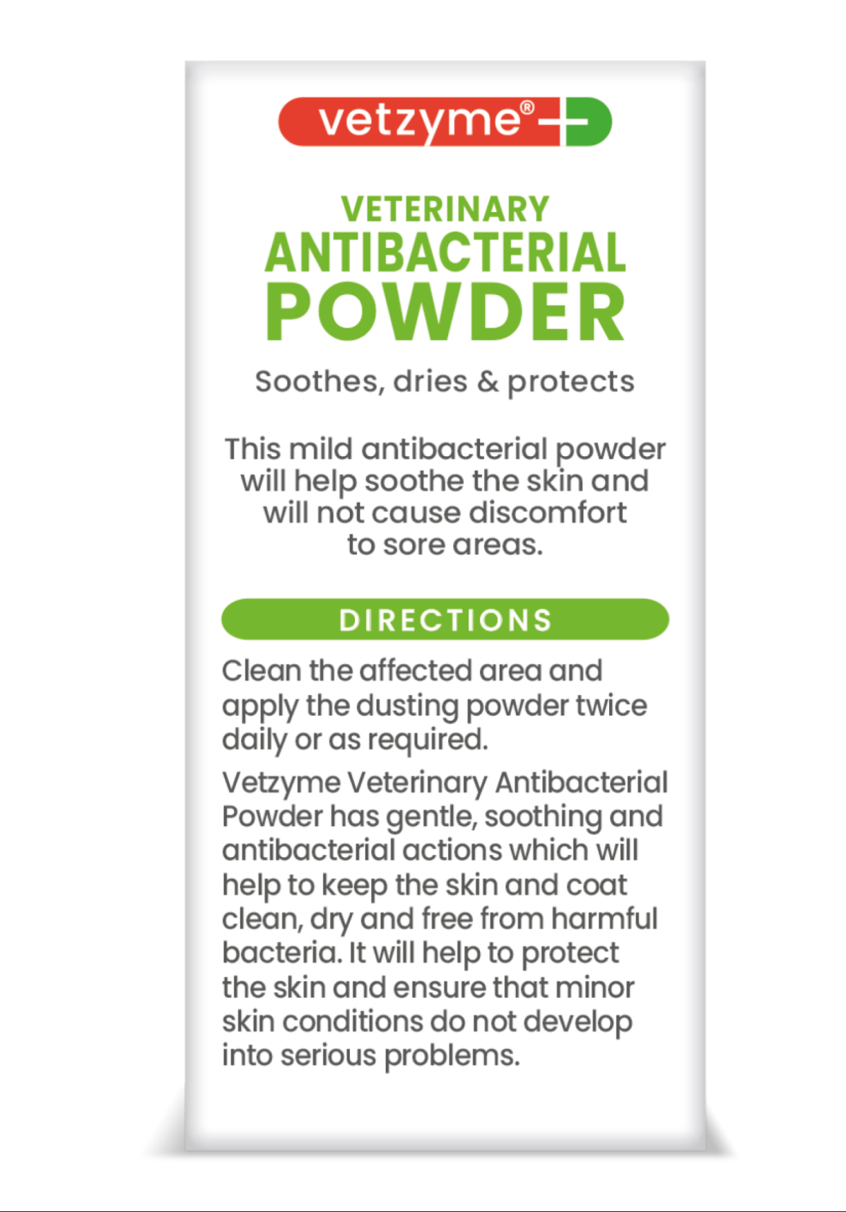 Vetzyme Veterinary Antibacterial Powder has gentle, soothing and antibacterial actions which will help to keep the skin and coat clean, dry and free from harmful bacteria. It will help to protect the skin and ensure that minor skin conditions do not develop into serious problems.